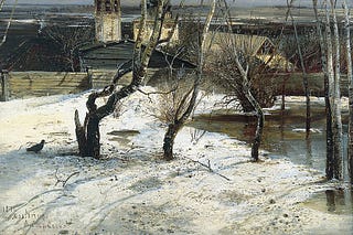 Frozen landscape stretches endlessly in every direction, interrupted only by the thick trunks of trees and groves of evergreens.